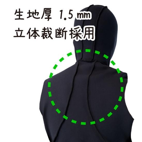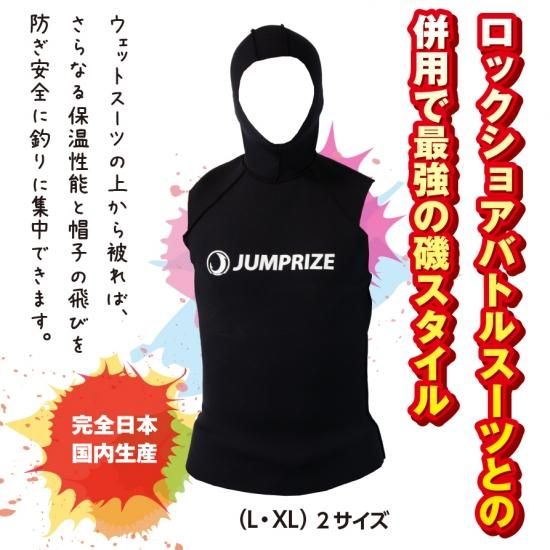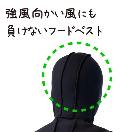 強風向かい風にも負けないフード付きベストです。ウェットスーツの上から被れば、さらなる保温性能と帽子の飛びを防ぎ安全に釣りに集中できます。顎の部分は伸び縮みにより口元をすっぽり隠すことも可能です。内側の素材をスルスル滑るリベロという生地にしているので、脱ぎ着もしやすくなっています。ロックショアバトルスーツとの併用で最強の磯スタイルが完成します。
